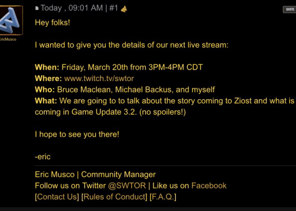 March 20th from 3pm-4pm CDT via twitch.tv/swtor with some news of 3.2 update.