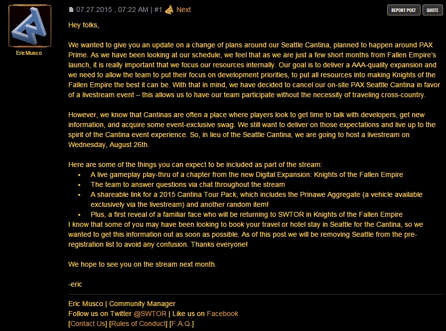 As we draw closer to the release of #KnightsoftheFallenEmpire expansion, many of us wonder what exactly are we in stored for? Bioware hasn’t really said too much, but on August 26th a live stream will take place showing actual gameplay of #KotFE. Bioware decided that they were cancelling the Community Cantina and instead were doing a live stream where they’ll hand out Cantina codes to viewers and other swag they will be giving away. You’ll be able to watch through twitch.tv/swtor. The announcement is below (link).